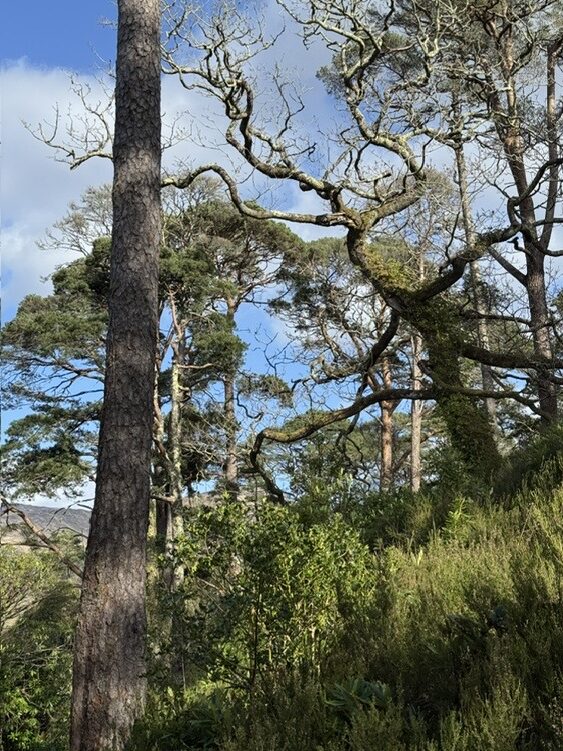 This is Yew tree which is estimated to be about 1000 years old. They were grown to provide certain kinds of wood for bows and arrows and also used in monasteries because it kept the vermin away since the various parts of the tree could be poisonous to some animals.