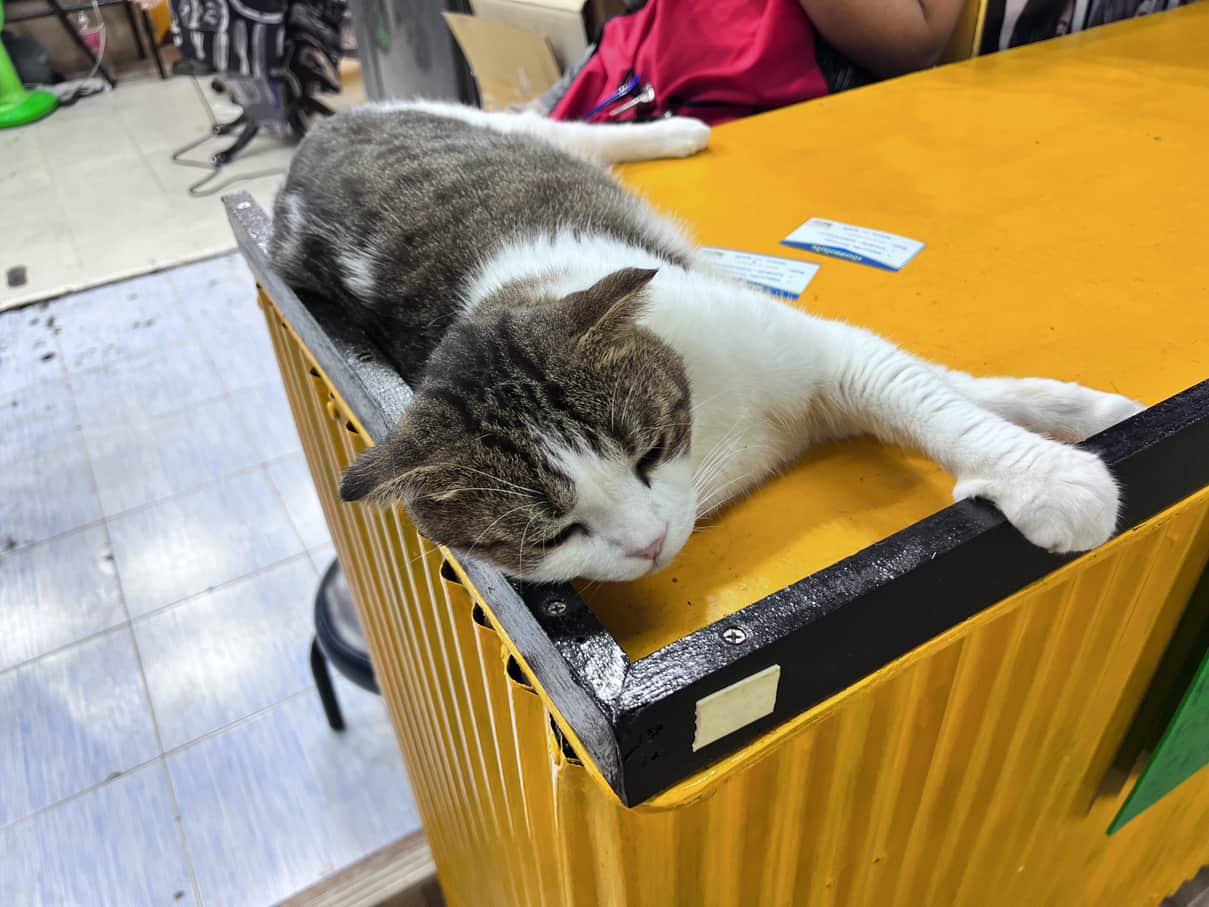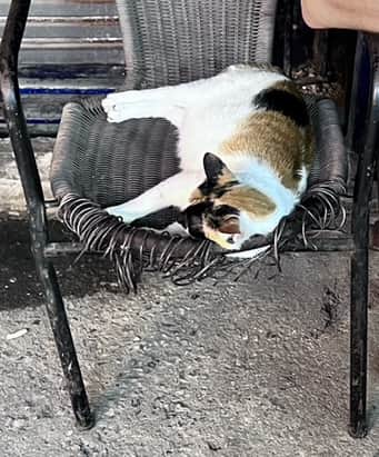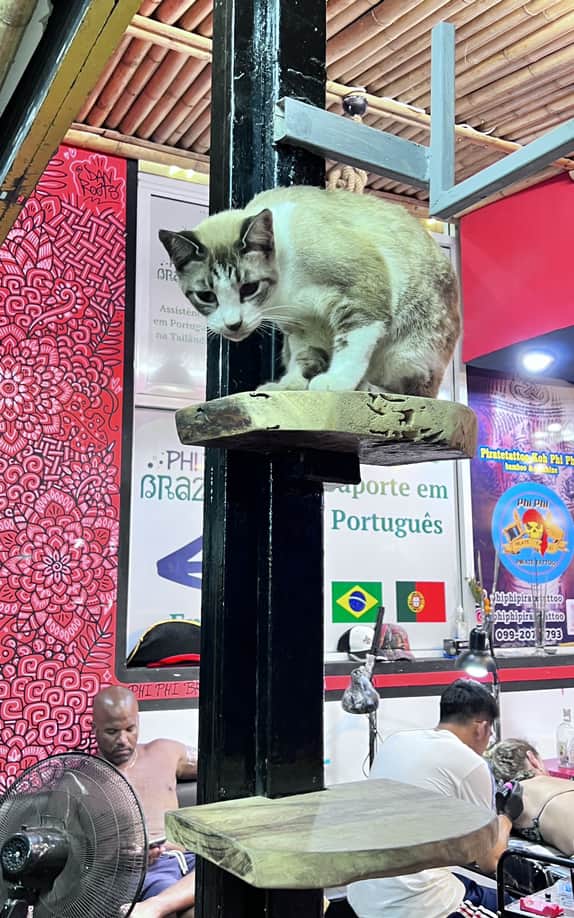 On Phi Phi island in the southern part of Thailand, I was surprised to see the island just as compact with shops, travel agents, and restaurants, as well as hotels, as it was before the tsunami which destroyed everything on the island except buildings erected on one of the two steep volcanic and limestone hills. Another thing that surprised me is the number of cats, all who are very friendly, taking care of whatever kind of vermin the shopkeepers may not like. Here are some of these cats stories. By the way, there are no dogs on the island and that could be due to the indigenous Muslim population.