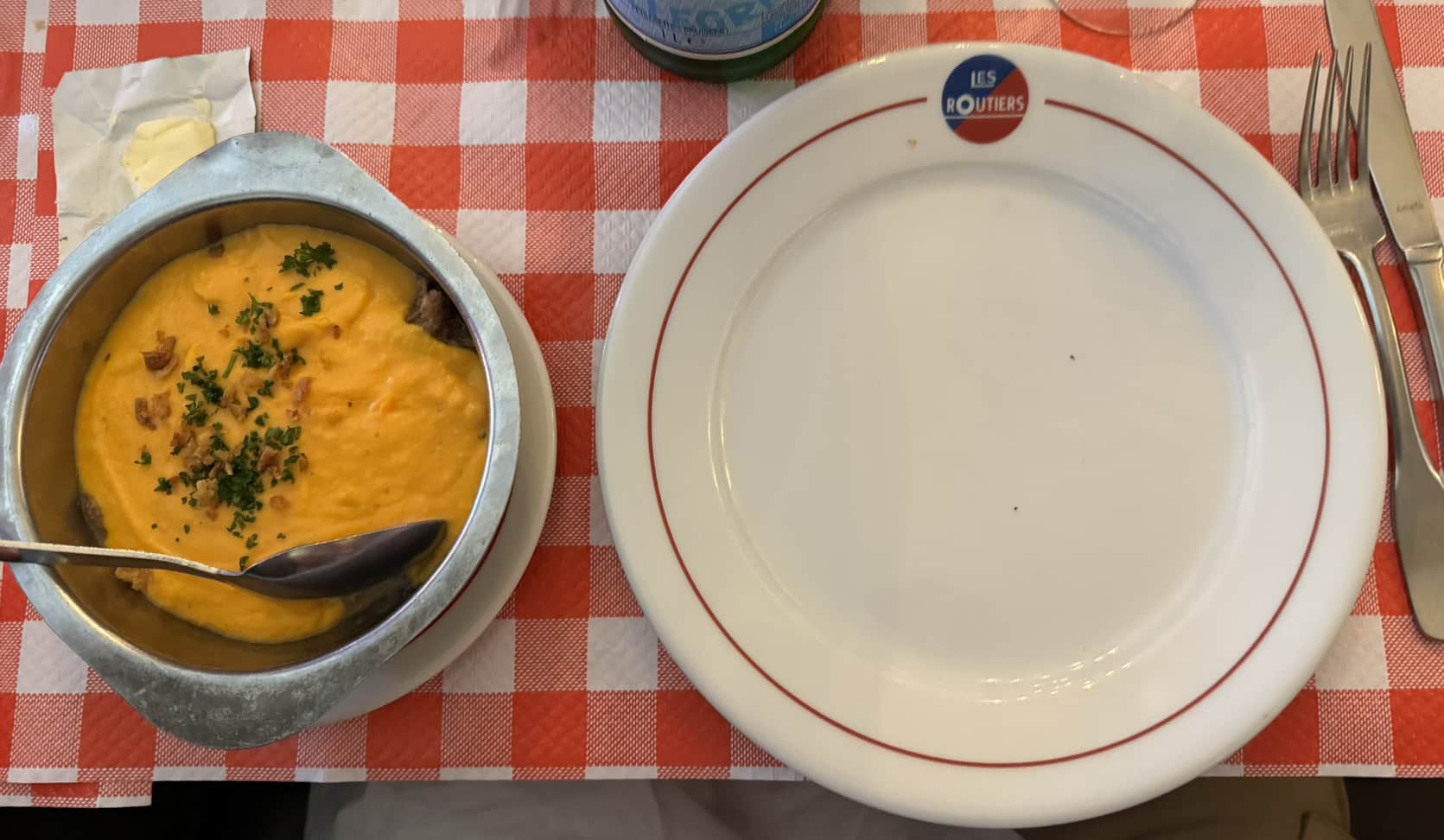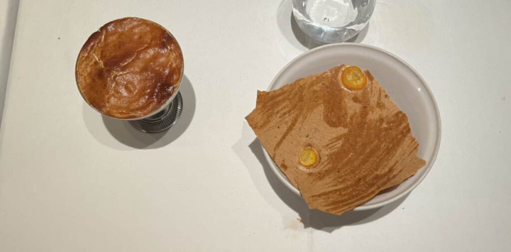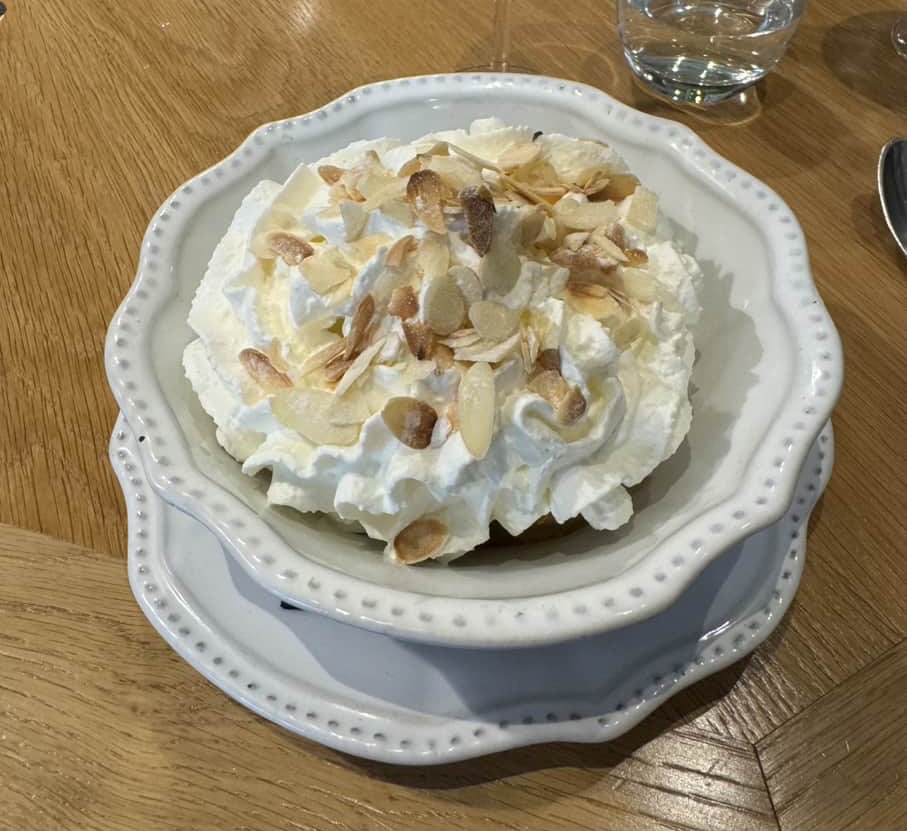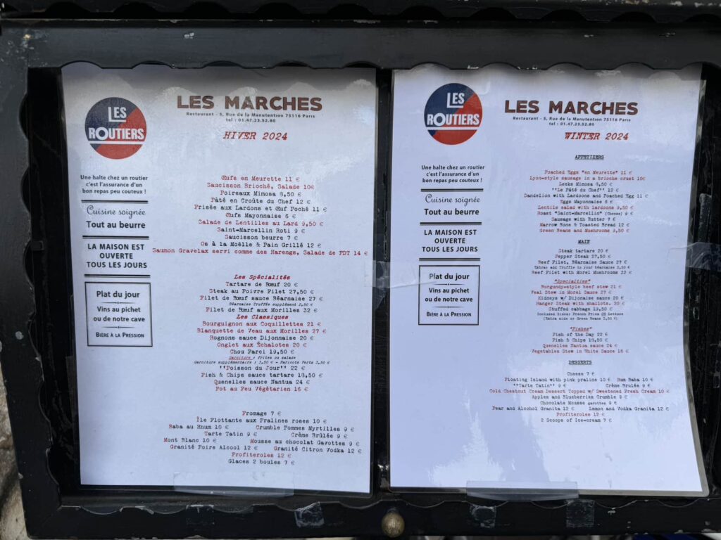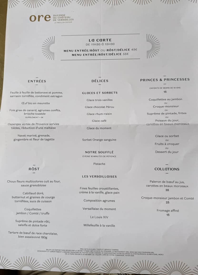 A local bistro’s idea of fish and chips And their idea of Caesar salad This was my hamburger with sauce all over it, very French, sauce on everything Some wild animalBeef tartar on the right in abundance. The portion was way too much for me but I learned it was named after the tartars who often didn’t have time or the proper cooking equipment to grill the beef. I suspect they had it raw because they had to go kill some people on a fixed schedule. Coffee ice cream dessert. I was surprised this time all the desserts were extremely sweet, much more than I had remembered. The menu from the restaurant in Versailles Multicolored cauliflower Very tasty ice cream Another dessert Scallops An orange flavored dessert The typical morning breakfast at the hotel This is a very local and traditional cuisine restaurant. The food is not fancy but it seems it is very well known for its excellence Our friend has a niece who works in this restaurant. It has been open only for less than a year but a few days after we ate here they received their first Michelin star Potato skin and sauce The central theme that night was potatoes Dessert