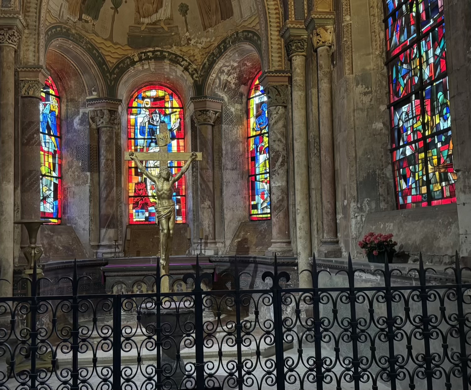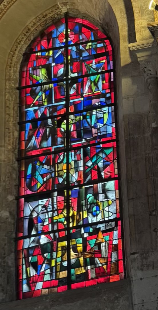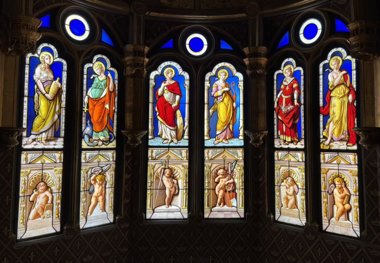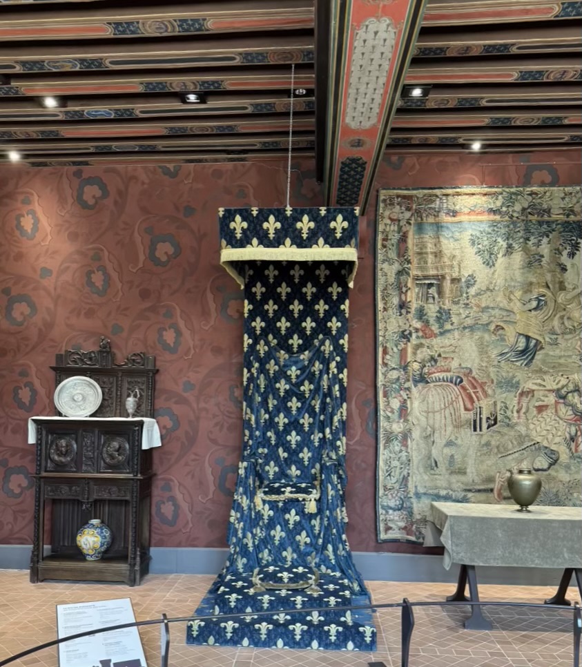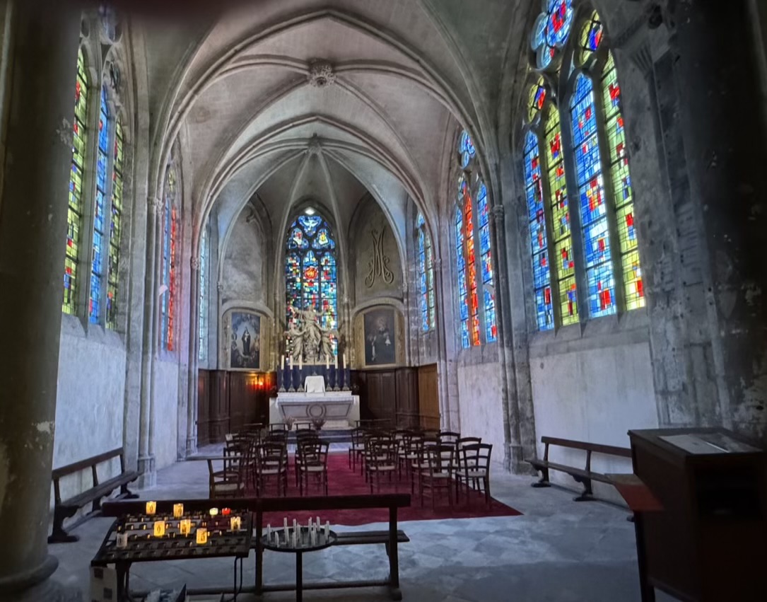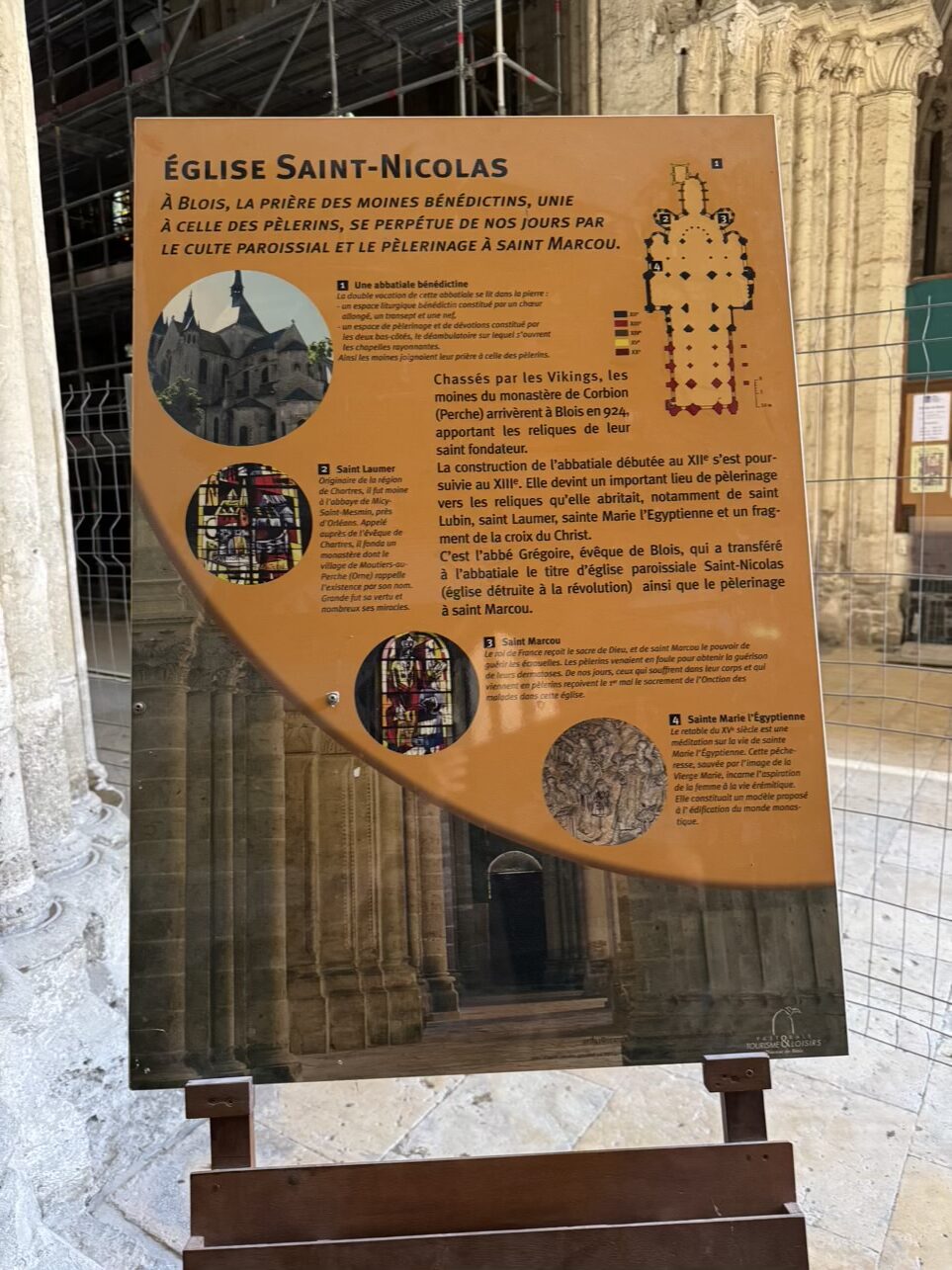 The beautiful fireplace on the ground floor of the François structure Some remaining artifacts are displayed here but the explanation says there are not many left since quite a few if not most were badly damaged since the king had to move here and there to remain control of his realm, stashing many objects in trunks and carried by carriages.One of the remaining trunks Day to day life followed a rhythm of daily prayers. The fervently Christian King and Queen attended daily public masses in the chapel and also had an oratory in their residence to allow them to pray in private. The windows of this oratory, commissioned in 1858 by Duban from the master glassmaker Claudius Lavergne, were inspired by Michel Dumas’ sketches. The Saints shown with their symbols all had a link to Catherine de’ Medici and the Valois familv.The King’s bedroom where he used to accept visitors A beautiful view of the town A porcelain violin A very old town A former main street Church of Saint Nicholas under repair The main altar I really love this windowEach of the different alcoves had different color themes for the stained glass windows which I found to be very beautiful and creativeA display of the varying window concepts