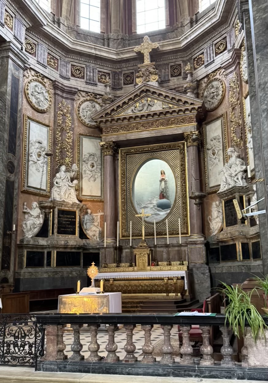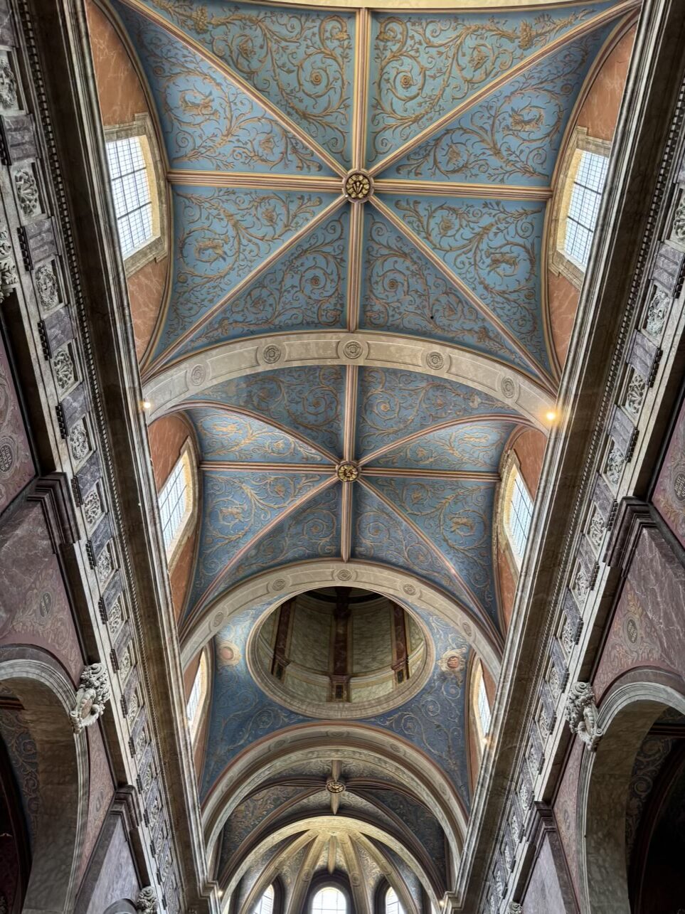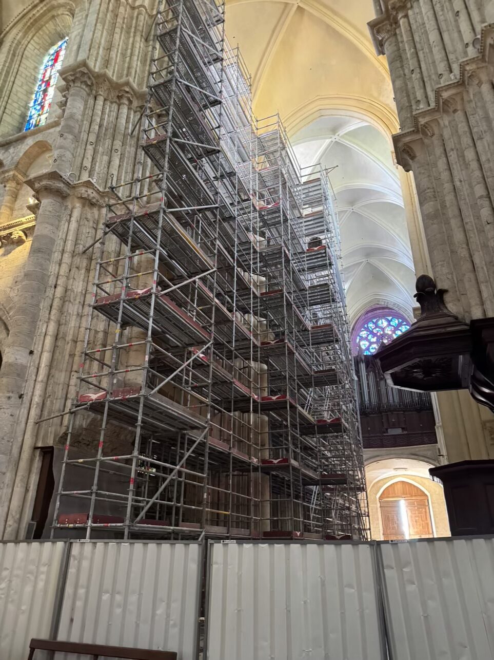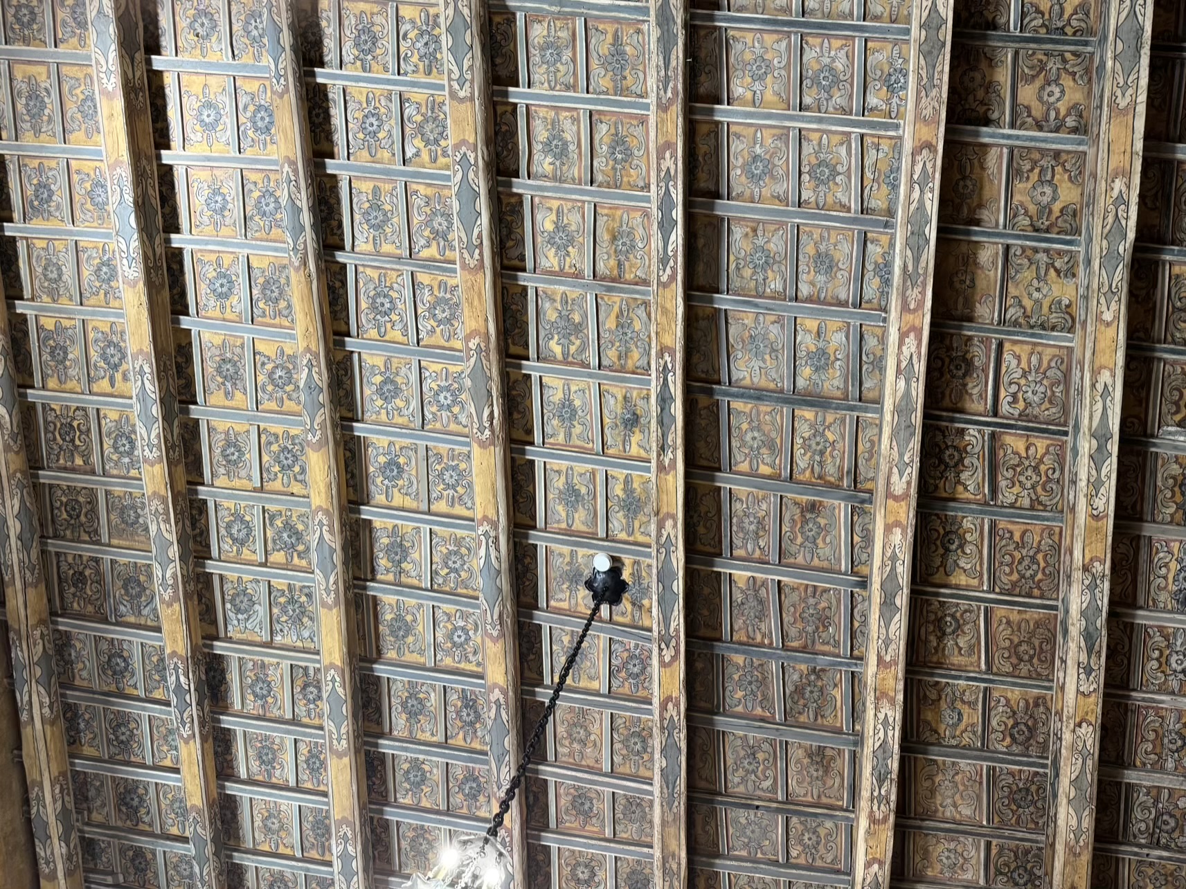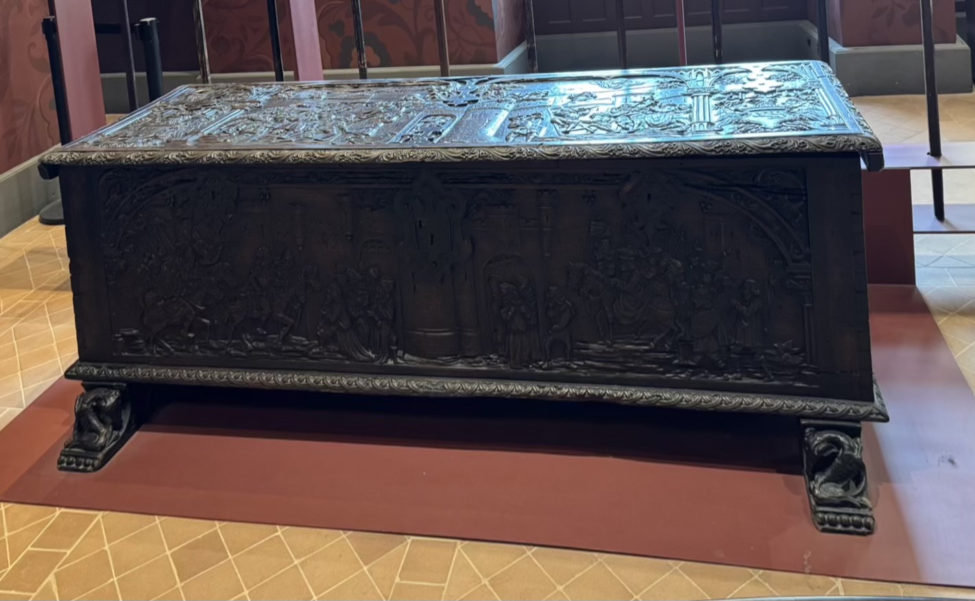 The beautiful fireplace on the ground floor of the François structure Some remaining artifacts are displayed here but the explanation says there are not many left since quite a few if not most were badly damaged since the king had to move here and there to remain control of his realm, stashing many objects in trunks and carried by carriages.One of the remaining trunks Day to day life followed a rhythm of daily prayers. The fervently Christian King and Queen attended daily public masses in the chapel and also had an oratory in their residence to allow them to pray in private. The windows of this oratory, commissioned in 1858 by Duban from the master glassmaker Claudius Lavergne, were inspired by Michel Dumas’ sketches. The Saints shown with their symbols all had a link to Catherine de’ Medici and the Valois familv.The King’s bedroom where he used to accept visitors A beautiful view of the town A porcelain violin A very old town A former main street Church of Saint Nicholas under repair The main altar I really love this windowEach of the different alcoves had different color themes for the stained glass windows which I found to be very beautiful and creativeA display of the varying window concepts