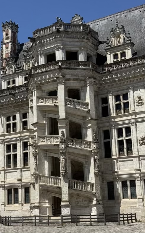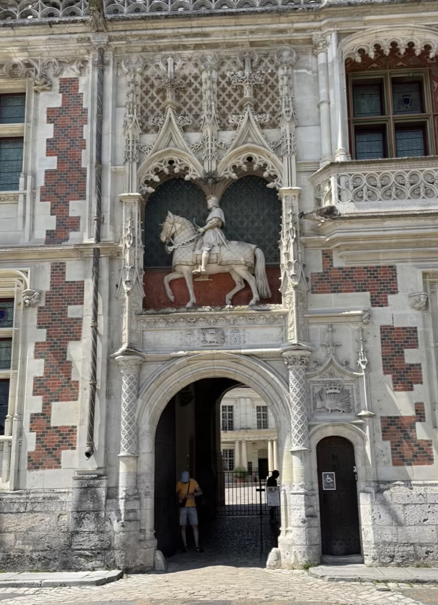 The castle entrance The beautiful castle entrance decorations with a king on a horse this structure was built by François I In Blois, France and occupied by Catherine Medici. Catherine left Italy, Florence, to become a queen of France and I believe one of the Strozzi family also went to France with her. My interest in this is that my great grandmother was a Strotz from Luxembourg and my great aunt claimed they were descendants of the Strozzi family of Italy, closely tied to the Medici family. No one has proven either way the veracity of this claim by my great aunt so I am spending time here and there trying to uncover the truth.This is a really beautiful staircase The farthest structure was built by Gaston of Orleans as he laid claim to the title of King after the death of the current king. However, his nephew was born and it was decided he would become the future King, Louis the 14th, the one who built Versailles.You can see the porcupine emblem above the door which it seems indicates the ability to shoot quills and conquer any adversary. in the chapel you see this beautiful ceiling with the light blue of the French royaltyThis medieval structure as a defense battery remainsHey beautiful view of the town The square corner building is left from the medieval times. The structure was built by Louis XIIThe staircase was built recently but the inside decorations were finished before the building was suspended due to the inability of Gaston to become king and inherited enough money to finish the project