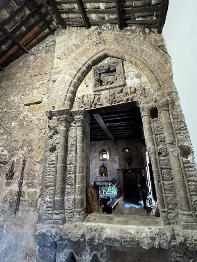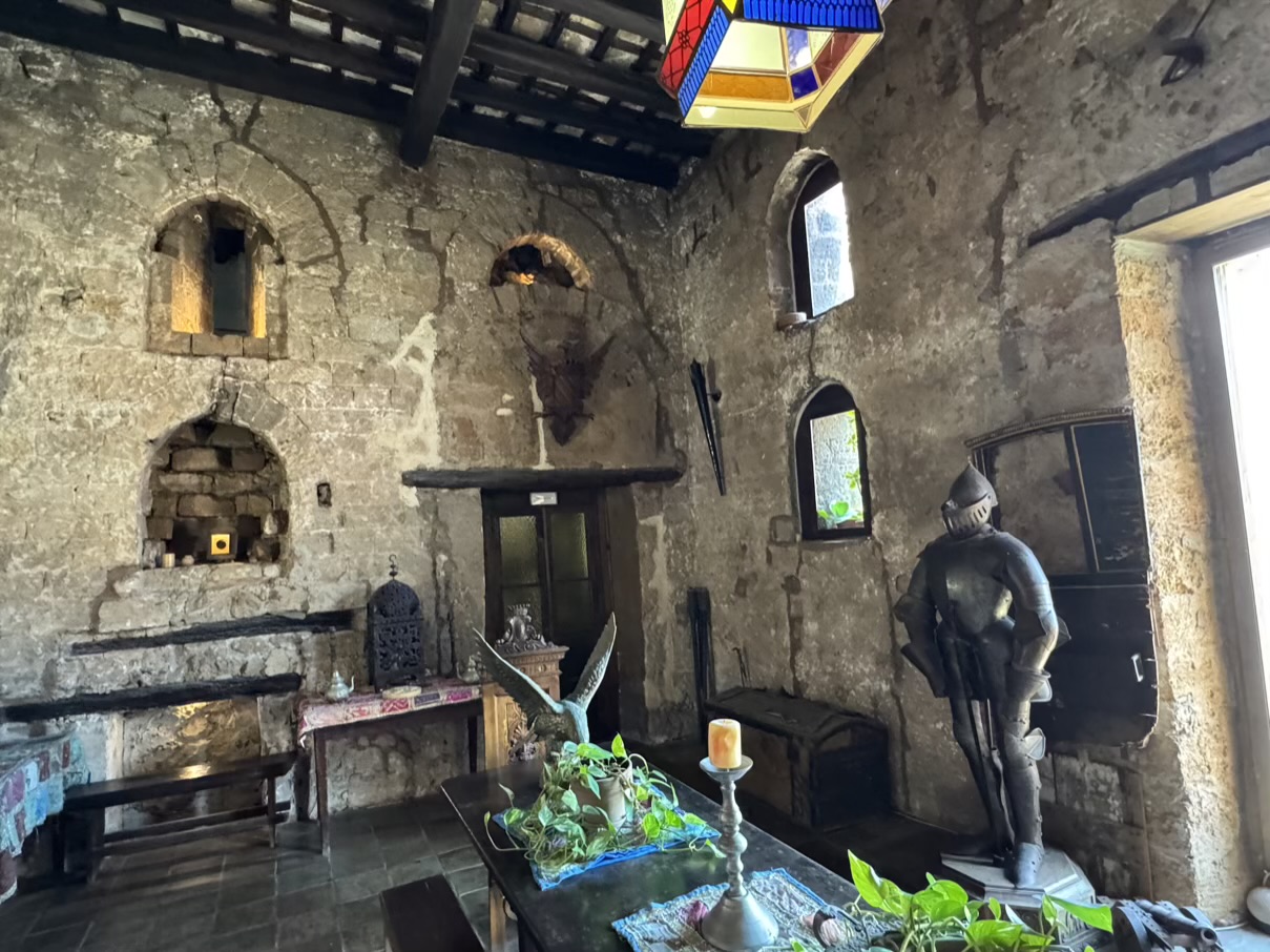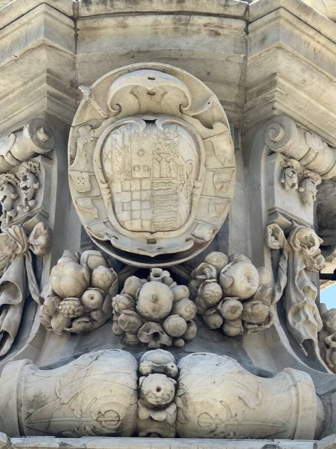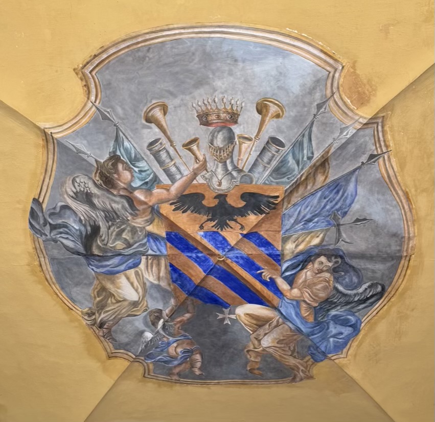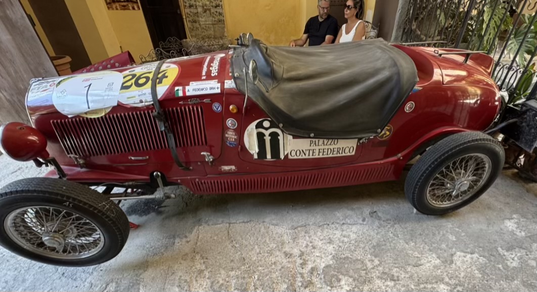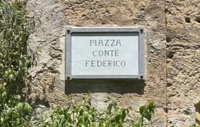 Plaque on the wall The entrance is very unassuming and looks slightly rundownThe 1930s race car often driven by Conte Federico. You can see the many sponsors of his racesYou see his name on the side of the car You can see this hubcap is clearly marked for the right sideAnd this one is marked for the left side The Federico family crest The princes mother is an equestrian and a performing professional singer this is the future count. His father is still alive and at 87 he is hoping to do some more racing. The future count has many titles depending upon the areas of land they used to own. But in the 1950s with land reform under the republic the king was exiled and the royalty had their land distributed. So the titles reflect no more land ownership except for the Palazzo. He gave us his tour.The family still lives in the palace. Here you can see some of the original but redecorated wooden ceiling. Much of the building was destroyed during the bombing of World War II.The original kitchen with the pizza oven, of course, during World War II a lot of the contents disappeared and we were told a significant amount was hidden in different places and when they went back they found nothing.This is from the original Norman Tower. The family is with origins dating back to Barbarossa and the Viking king Roger from the 900s. This tower was built in the 1100s and is one of the corners of the palace. You have to walk about 1 mile to get to the ocean now but when this tower was built the ocean came up right next to the tower and it was used for defensive purposes. here is some later decoration on the outside of the tower which is now inside the house created by Arabs and Spaniards who occupied the city at one time.