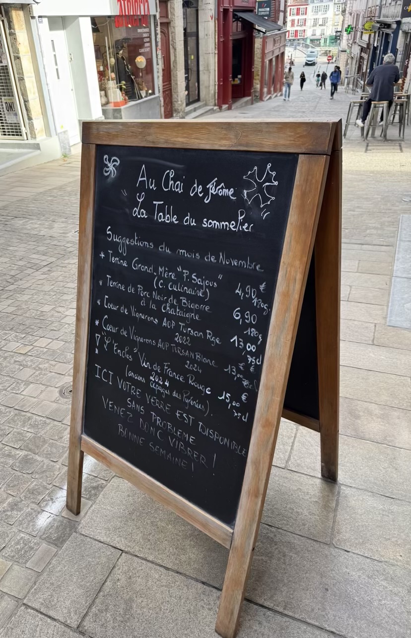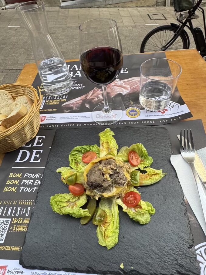 above I mentioned wine tasting. While walking I passed this Small restaurant and the owner, Jerome, a sommelier, greeted me and talked a little bit about the wine tasting he offers and some foods he has in the restaurant. But the most interesting things he mentioned were concerning the local and tourist attraction to big name and fashion restaurants and chains. He explained it’s not easy for independent shops like his to attract attention. Since I am not really attracted to big names or fashion I decided to give his offering a try as he provided to tastings of reds, one with a lot of tanin flavors and another one from 300 m up in the hills not far from Bayonne. That one was more interesting for me so I ordered it and then the second option on the menu which was a pork liver pate with chestnuts and a vinaigrette dressing for the lettuce and tomatoes. It went extremely well with the wine. These little shops are the places you should be visiting since they have not only good service and attention to details but they are very personalized and the people are interesting. Jerome knew some of the wines from California and so we had a discussion about some different flavors. Having the opportunity to receive an introduction to local wines and pairing foods from a sommelier is usually extremely expensive but not at Jerome‘s shop. If you’re ever in Bayonne make sure you stop by, taste a few wines and get his suggestions for the food that goes with it. This was the highlight of my visit to Bayonne.