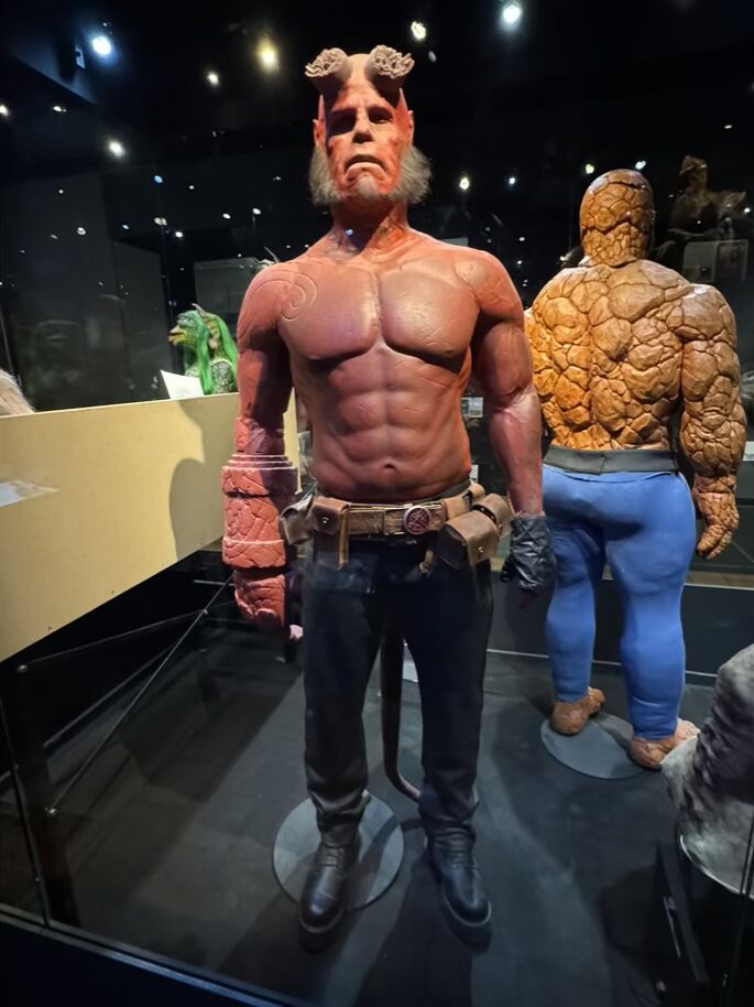 My new buddy from Beatleguise. A Ford Anglia I recognized right off. I had a miniature Matchbox version years ago. It was used in an England movie. Lyon Cinema MuseumA ghost capture device from Ghost Busters.Edward Sissorhands` handOne of the old movie camers used for many decades produced in the first town I lived in, for just one year.One of the original auto tape destroying recorders used in the Mission Impossible TV series.Mock heads used in the Thelma and Louise cliff dive final scene.One of the original Batman costumes.AlienDarth Vader mask and gunHellboy suit. This would be very hot to wear.The way an actor gets “run through”Gun from Bonanza
