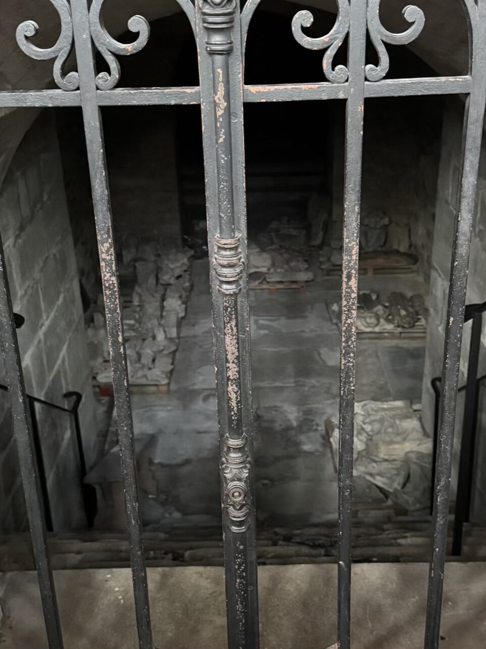 The beautiful fireplace on the ground floor of the François structure Some remaining artifacts are displayed here but the explanation says there are not many left since quite a few if not most were badly damaged since the king had to move here and there to remain control of his realm, stashing many objects in trunks and carried by carriages.One of the remaining trunks Day to day life followed a rhythm of daily prayers. The fervently Christian King and Queen attended daily public masses in the chapel and also had an oratory in their residence to allow them to pray in private. The windows of this oratory, commissioned in 1858 by Duban from the master glassmaker Claudius Lavergne, were inspired by Michel Dumas’ sketches. The Saints shown with their symbols all had a link to Catherine de’ Medici and the Valois familv.The King’s bedroom where he used to accept visitors A beautiful view of the town A porcelain violin A very old town A former main street Church of Saint Nicholas under repair The main altar I really love this windowEach of the different alcoves had different color themes for the stained glass windows which I found to be very beautiful and creativeA display of the varying window concepts