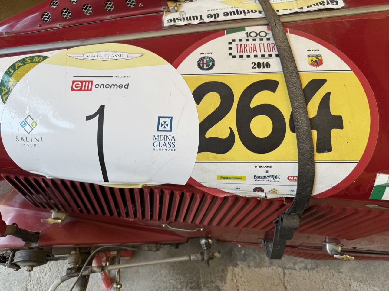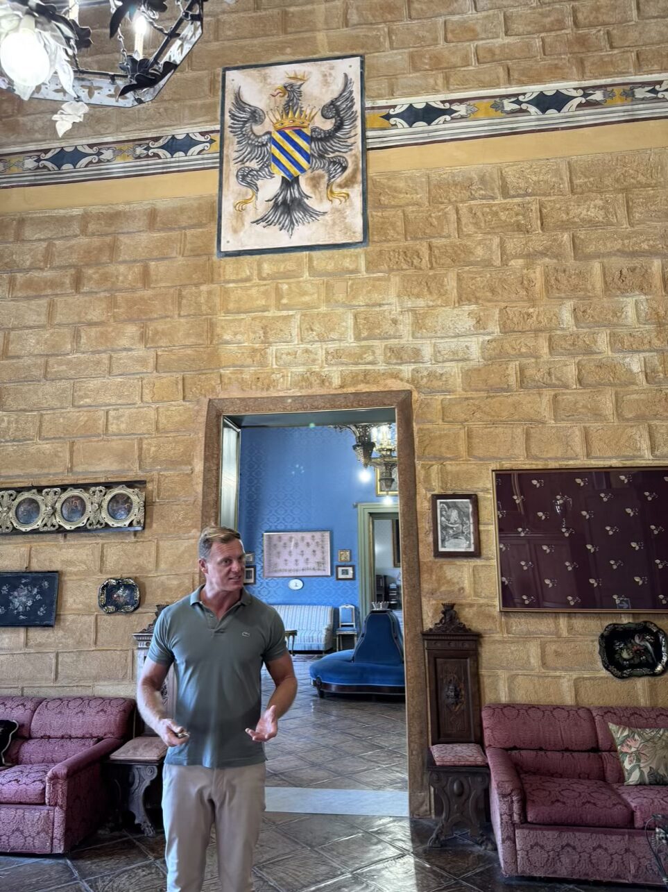 Plaque on the wall The entrance is very unassuming and looks slightly rundownThe 1930s race car often driven by Conte Federico. You can see the many sponsors of his racesYou see his name on the side of the car You can see this hubcap is clearly marked for the right sideAnd this one is marked for the left side The Federico family crest The princes mother is an equestrian and a performing professional singer this is the future count. His father is still alive and at 87 he is hoping to do some more racing. The future count has many titles depending upon the areas of land they used to own. But in the 1950s with land reform under the republic the king was exiled and the royalty had their land distributed. So the titles reflect no more land ownership except for the Palazzo. He gave us his tour.The family still lives in the palace. Here you can see some of the original but redecorated wooden ceiling. Much of the building was destroyed during the bombing of World War II.The original kitchen with the pizza oven, of course, during World War II a lot of the contents disappeared and we were told a significant amount was hidden in different places and when they went back they found nothing.This is from the original Norman Tower. The family is with origins dating back to Barbarossa and the Viking king Roger from the 900s. This tower was built in the 1100s and is one of the corners of the palace. You have to walk about 1 mile to get to the ocean now but when this tower was built the ocean came up right next to the tower and it was used for defensive purposes. here is some later decoration on the outside of the tower which is now inside the house created by Arabs and Spaniards who occupied the city at one time.