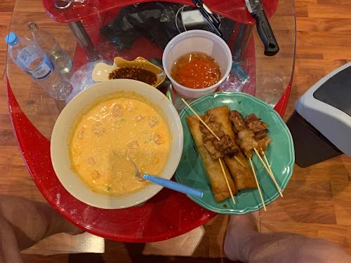 Small foods, dipping sauces and some curry with extra coconut milk with rice inside. One of my favorite food carts. Food from the north east to Thailand (IISan).