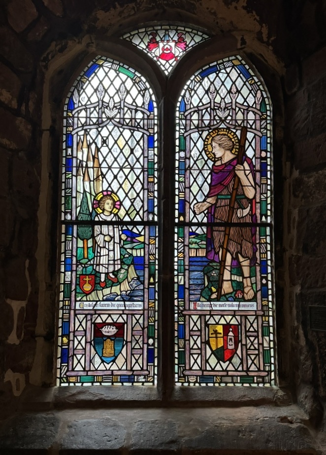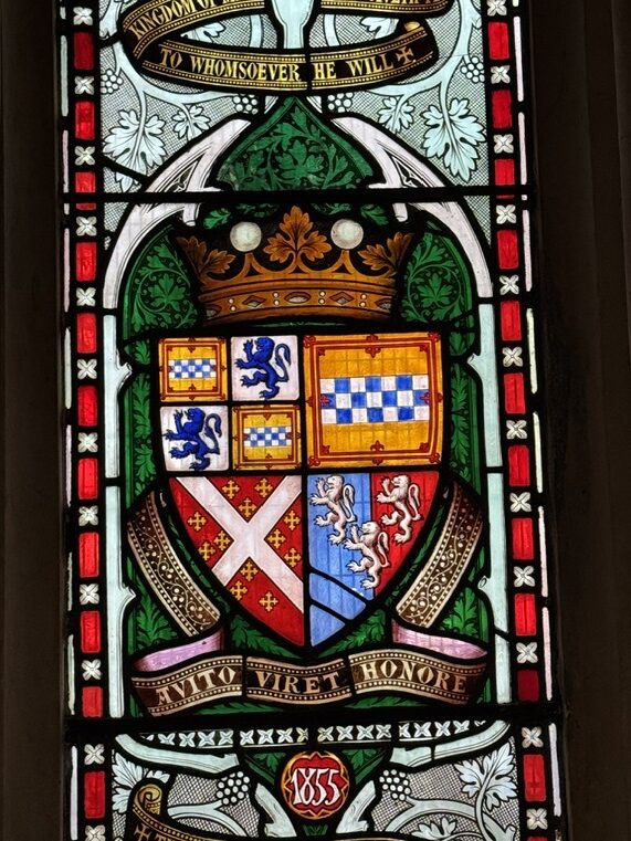 These two windows were commissioned by Sophia, Marchioness of Bute in 1855. At this time Sopia was a widow, and her son (John, the third Marquis) was still a minor. No information is yet known on the designer or maker of these windows, though it seems safe to assume they were created by the same person given the similarity of design. The left hand window shows the paternal arms of the donor, and the other window shows the arms of the families to have possessed Cardiff Castle from 1091 to the mid 19″ century.