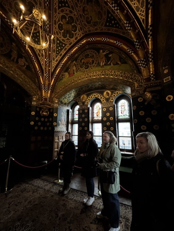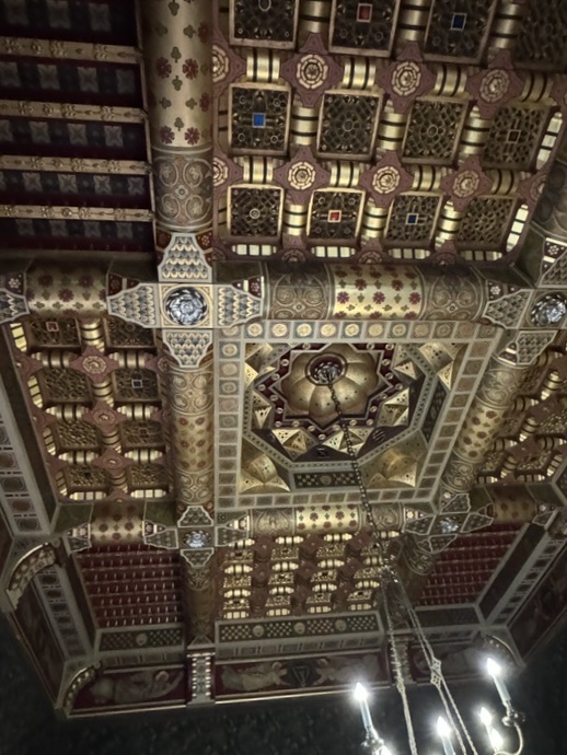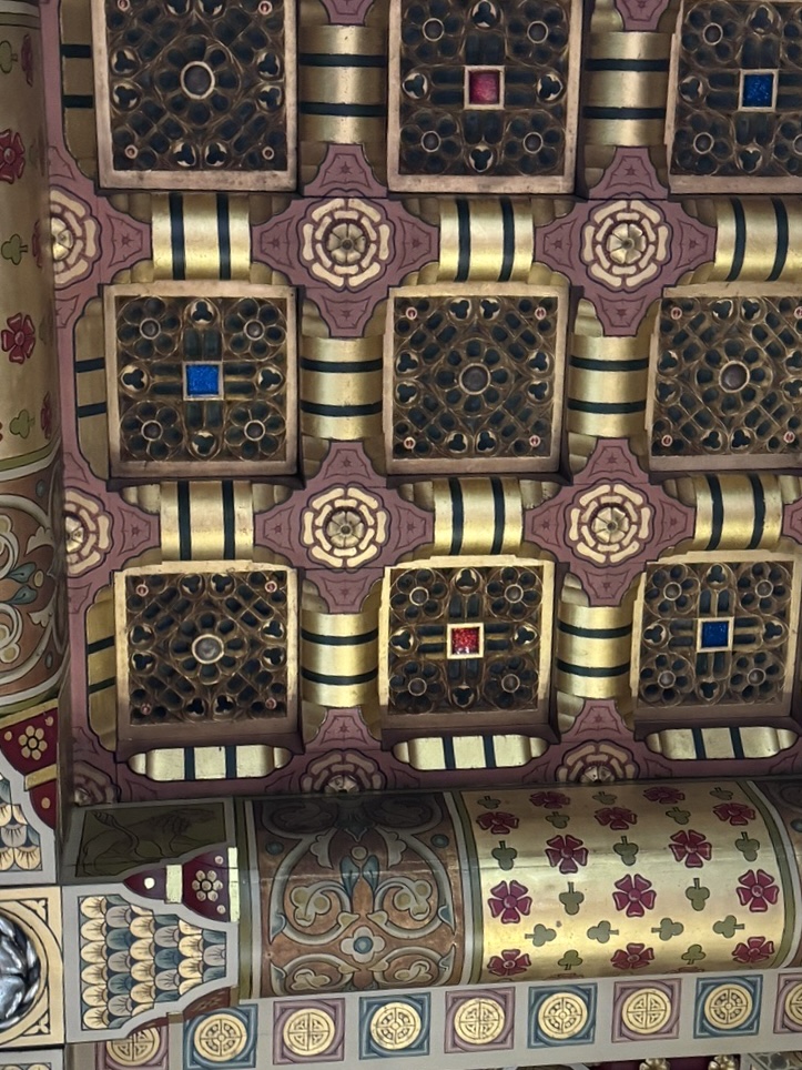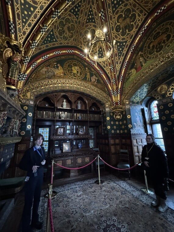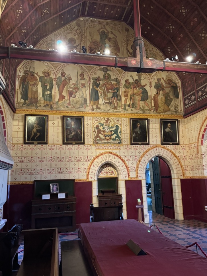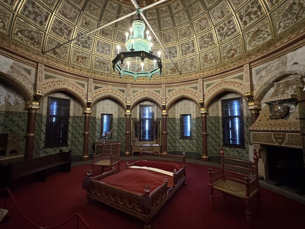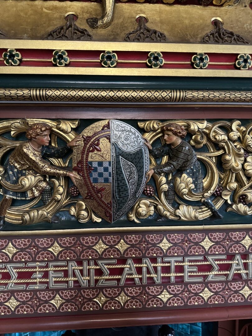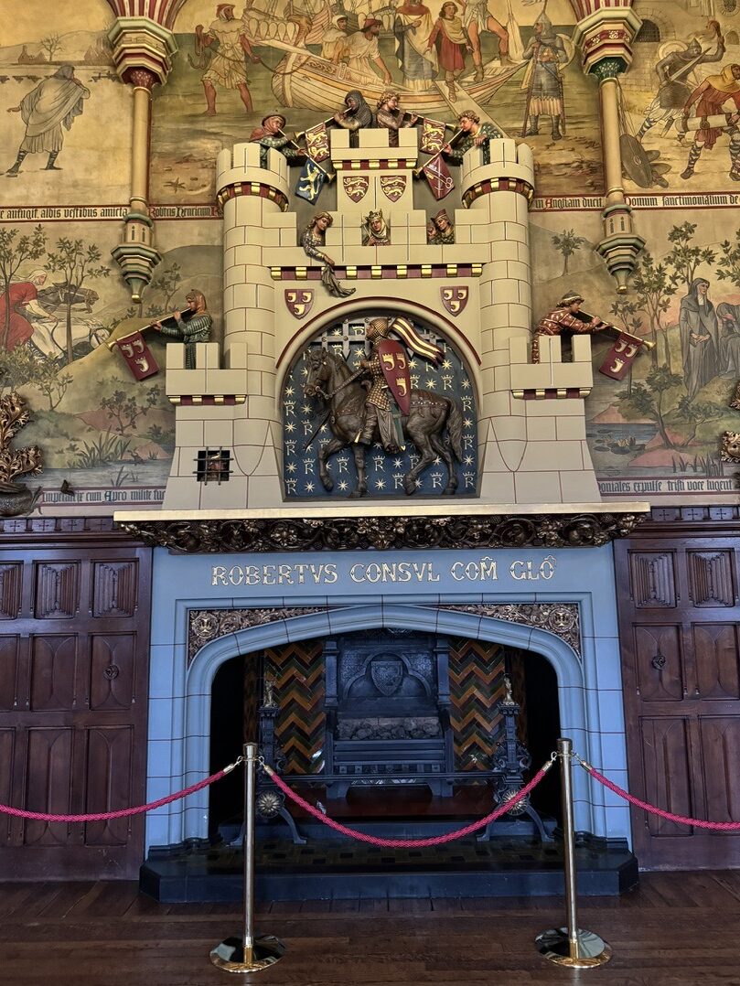 The entrance to the castle The castle from a distanceThis clock tower is very interesting This gate actually looks very welcoming The elaborate rooms were created by the Marquess of Bute, a descendent of the royal Stuart family of Scotland and also of the BrucesUnbelievably beautiful ornatenessAll of the decorations were employed to tell stories Each room had a fireplace to keep it warm. You will notice the family crest over the fireplace The playroom for the children. The walls were decorated with an ancient tales to educate and entertain the children Around the bird is an outline of a man. This was John who had this room decorated for his childrenA very secure door to lock someone in The dining hall The loft above was used for the musiciansAgain, storytelling within the design. Look at the castle above the fireplace. In the lower left you will see the face of a man behind bars. That was William the conqueror who was imprisoned hereThis was John’s bedroom. You notice in the right side of the room several corners where people could sit. The sun would shine at different places during the day so the people live here could change where they sit to get the sun. There was always glass up above to bring in sunlight to this fountain and gardenroom with storytelling around the wallsThis is a really beautiful ceiling These are real gems embedded in the middle of these squares in the ceiling Over one fireplace was a family shield, actually two. One was John’s family on the left and on the right was his wife’s shield World leaders gathered here after 2008President Obama attended