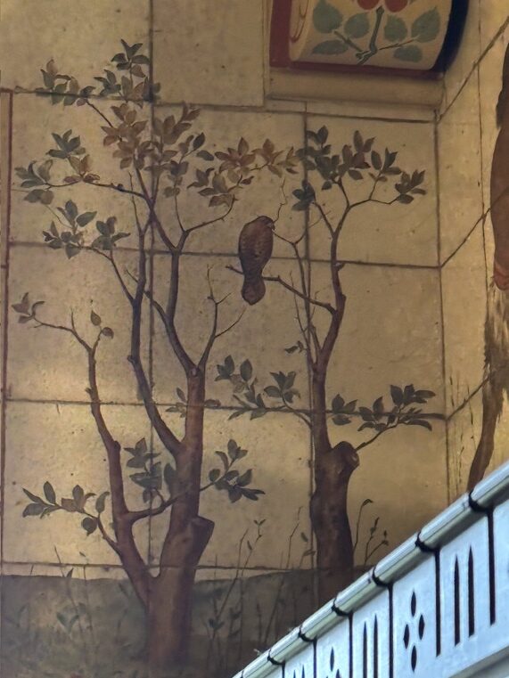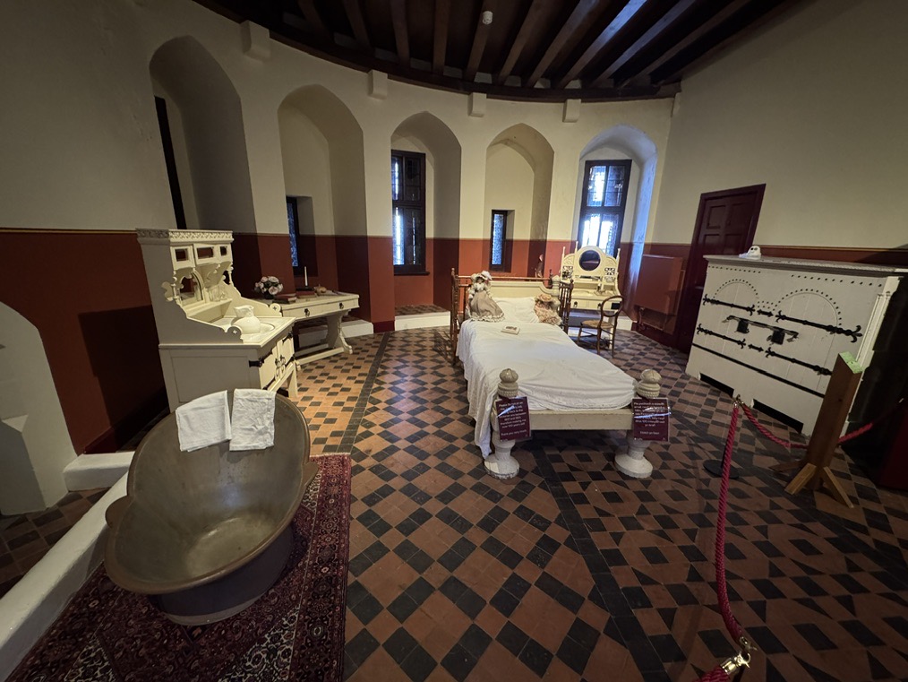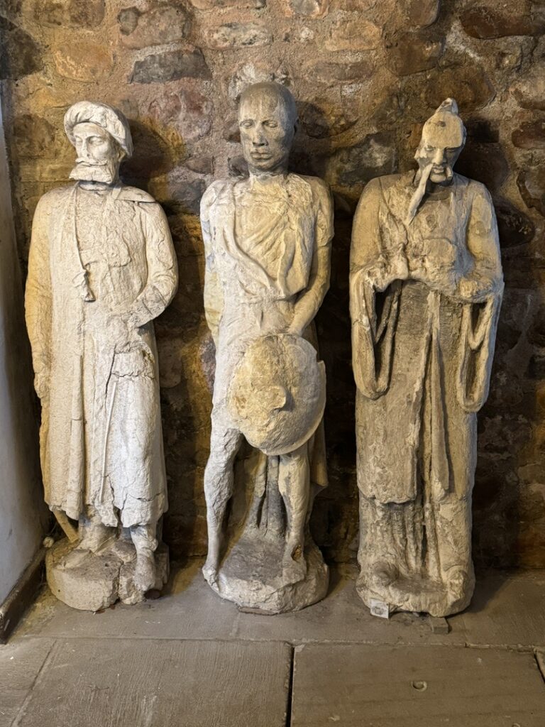 These are three Greek gods. Of course John was able to read an ancient Greek and Latin as well. This is the castle from the front. They are doing some restoration work. Various stories painted on the walls for edification. Family tree of the Lords of this areaThis is the sitting room. You will notice places to sit by the windows at different places in the room to catch the sun as it moves aroundA beautifully decorated ceiling The courtyard in the middle The bathing areaOne of the bedrooms Another beautiful ceiling with a wall which has a dual family crest of John and his wifeThis is John’s bedroom Another dual family crest which is different than the other one. I did not ask why they were different. the bedroom’s beautiful ceilingThis is just a display of what people were eating at the time at different parts of the day with some clothing from that eraThe bedroom of one of the children, Margaret Margaret’s bedroomThe modern entertainment machine This phone obviously was made for a left-handed person