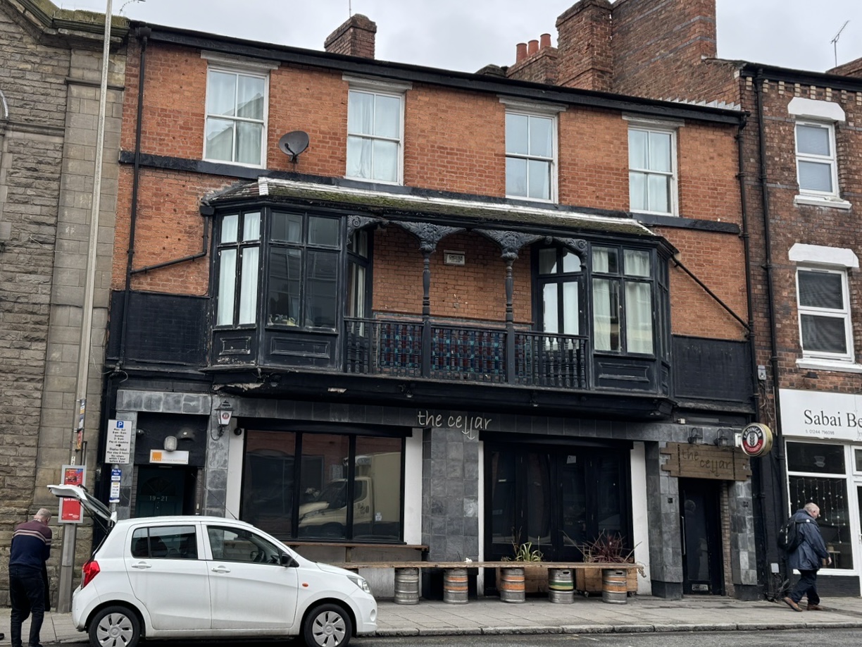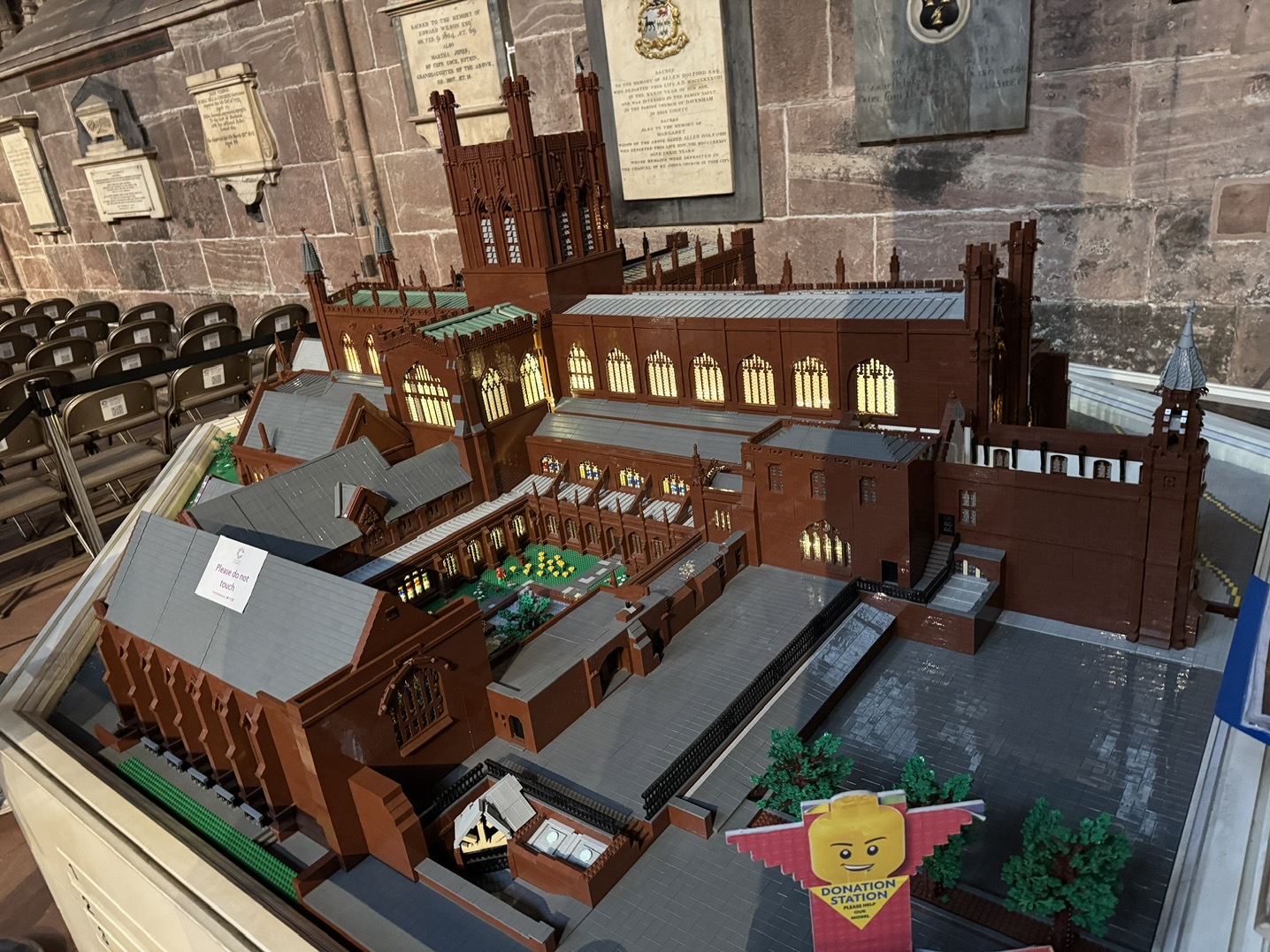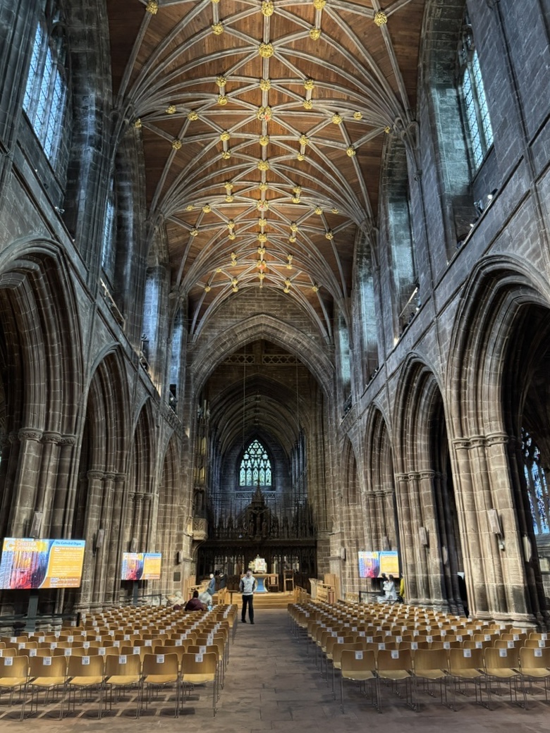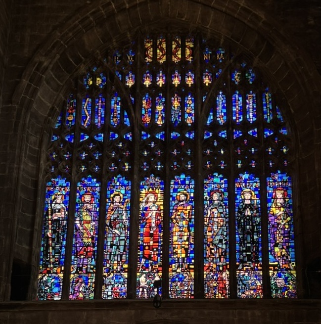 This is inside the cathedral which is very beautiful Looking back at the cathedral entrance These two photos are models of the cathedral as it stands nowFrom the back looking towards the front Beautiful stained glass windows These are ancient arches and the wall I think is from the Norman era so about 1000 years ago The walkway around the cloister On the ceiling in a chapel is this figure explained below. William Tracy who killed Thomas Beckett at the behest of Henry II had to go around and build three churches as penance for the murder. There was a good chance he may have been my ancestor.Explanation of the emblem A food court downtownThe rainbow colors spread out all along the large promenade This is actually one of the stations on the way from Birmingham to Chester, Shrewsbury station. It’s just an interesting old stationI asked the fellow what “off license” means. The fellow told me that the shops are just not part of a large corporation or a franchise. They are independently owned convenience stores. When I saw this building it just reminded me of Louisiana because of the balcony style This sure grabbed my attention. The pictures go from left to right. If you have a hair transplant you wind up with more hair. If a woman has an eyebrow transplant she winds up as a man. I found that pretty…. Different.A news and “off license” convenience store He wrote some of the old buildings downtown I made my own spaghetti sauce which was very delicious You have been warned. Going to a coffee shop you are now facing software from the US requesting tips.