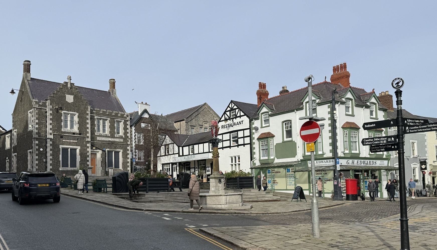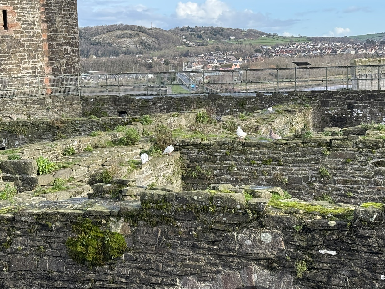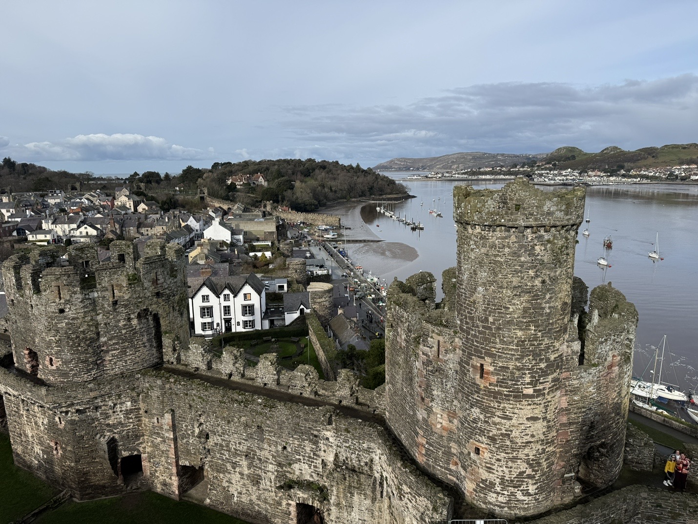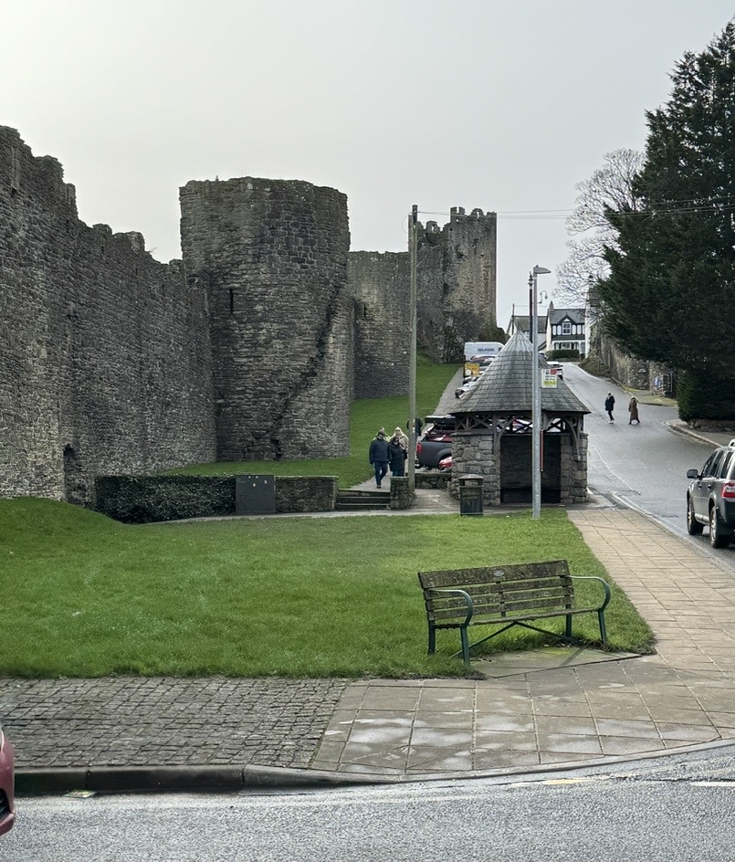 Booking down on the town entrance Just behind the pigeon on the rail the something that is white is actually a bird in flight It was cold enough to snow in the hills but not quite at the port. This was looking out from the castle A cute boat man had an appealing call to the children every three or four minutes A very old bank building near the station A small but adequate town square The train station is just this little place out of the rain. You better have already purchased your ticket somewhere else. And some people there told me that if the train is full they may not stop even though you’re on the scheduleIt’s an interesting profession for the Kurds. I am sure they do a great jobYou can walk the walls of the city which go all the way around and are extremely well preservedWalking around the backstreet I saw this exclamation that the occupants are obviously Welsh. You can tell by the dragon. On the union Jack there are four crosses. The cross for whales is David who slew the dragon.This was very tasty efficient chips except I exchanged the chips for onion rings. This little restaurant, mostly take away, is very famous
