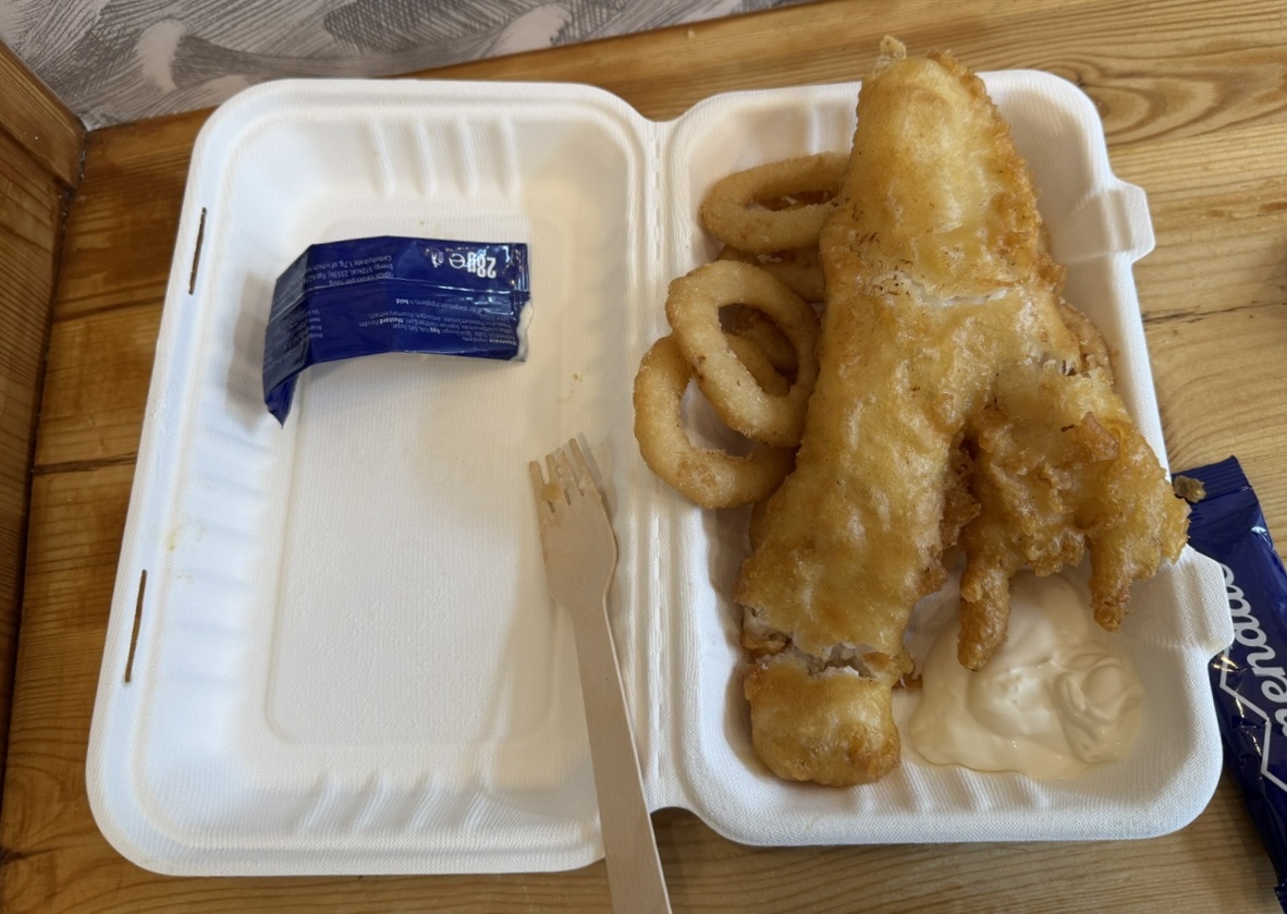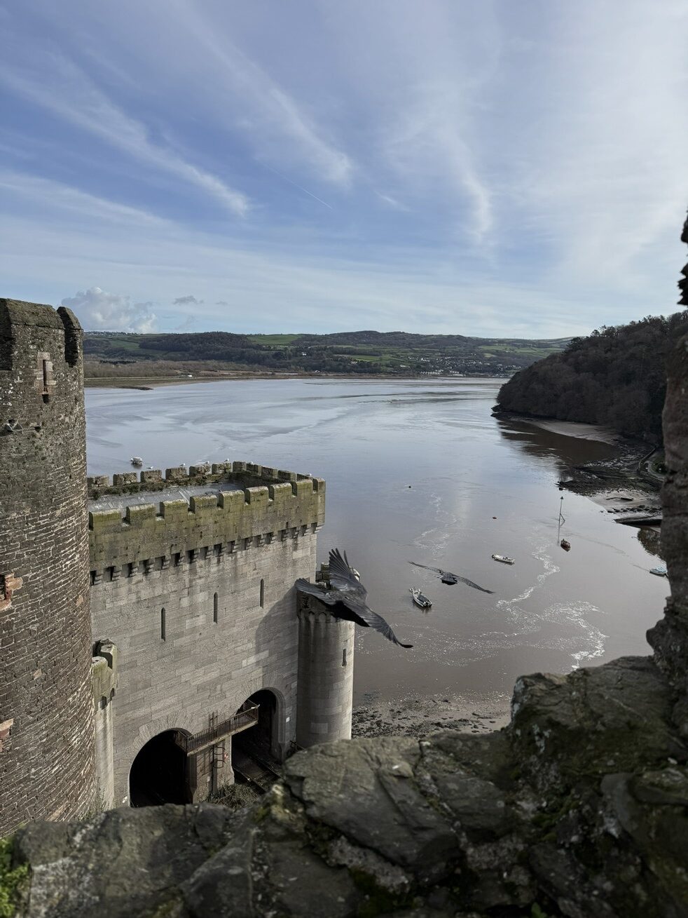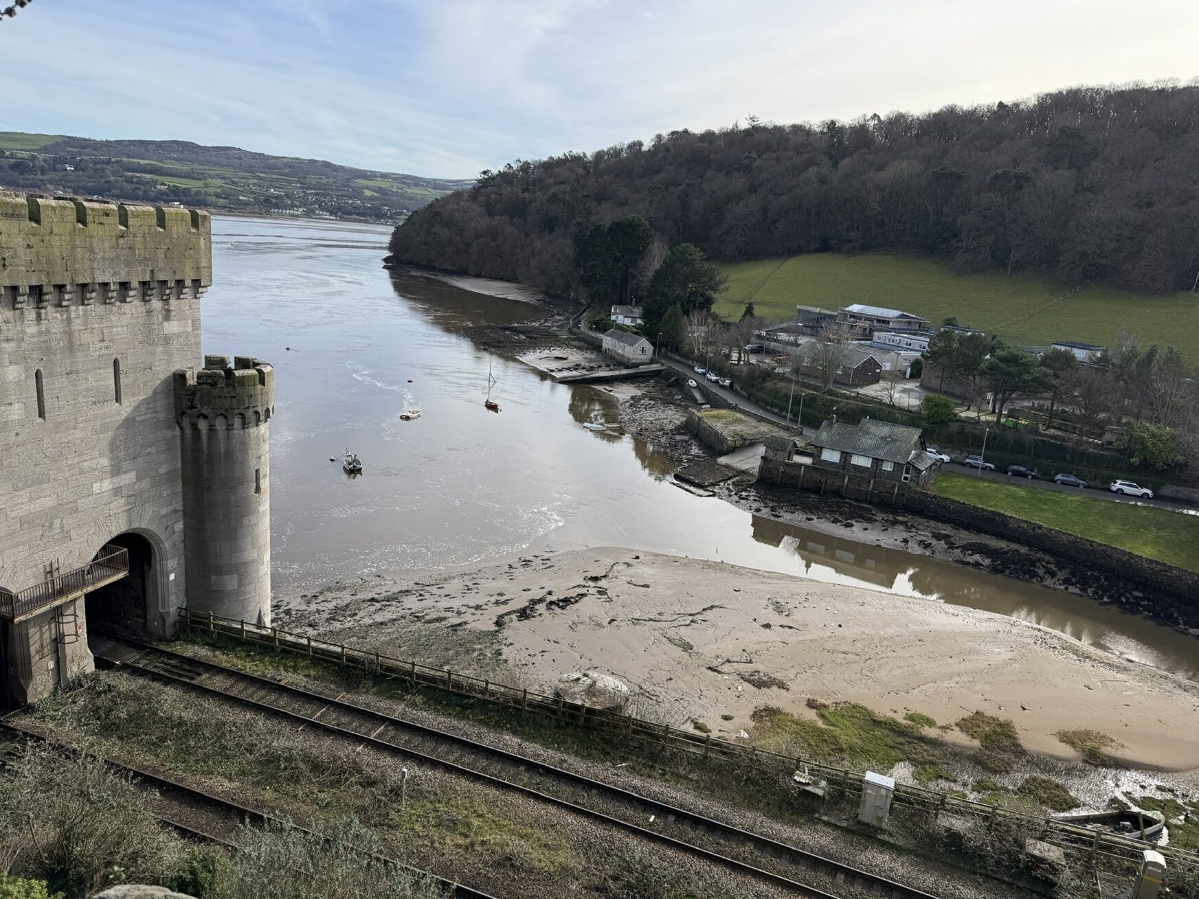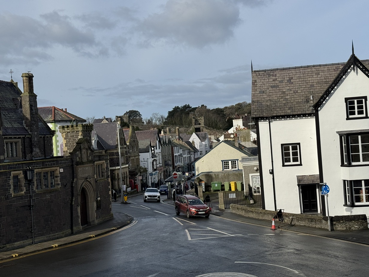 Booking down on the town entrance Just behind the pigeon on the rail the something that is white is actually a bird in flight It was cold enough to snow in the hills but not quite at the port. This was looking out from the castle A cute boat man had an appealing call to the children every three or four minutes A very old bank building near the station A small but adequate town square The train station is just this little place out of the rain. You better have already purchased your ticket somewhere else. And some people there told me that if the train is full they may not stop even though you’re on the scheduleIt’s an interesting profession for the Kurds. I am sure they do a great jobYou can walk the walls of the city which go all the way around and are extremely well preservedWalking around the backstreet I saw this exclamation that the occupants are obviously Welsh. You can tell by the dragon. On the union Jack there are four crosses. The cross for whales is David who slew the dragon.This was very tasty efficient chips except I exchanged the chips for onion rings. This little restaurant, mostly take away, is very famous