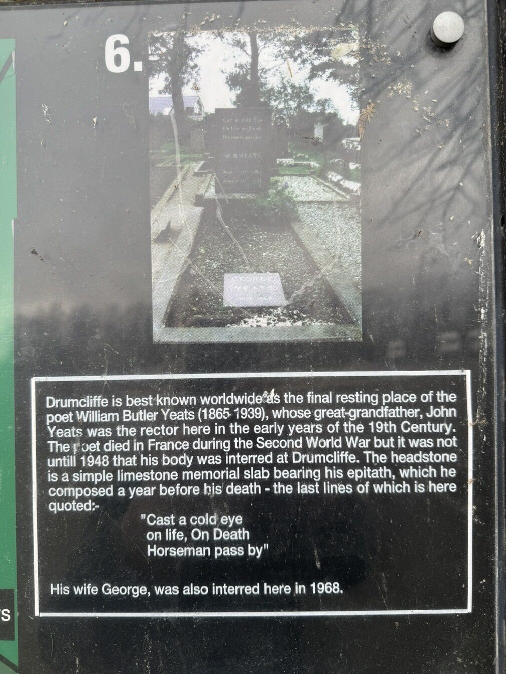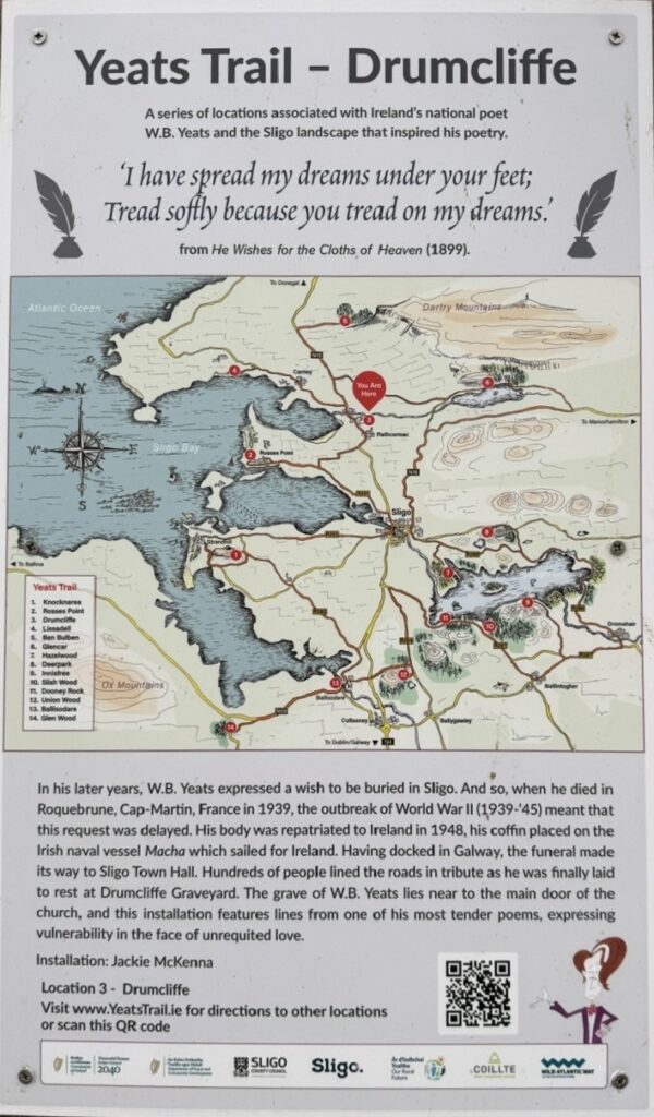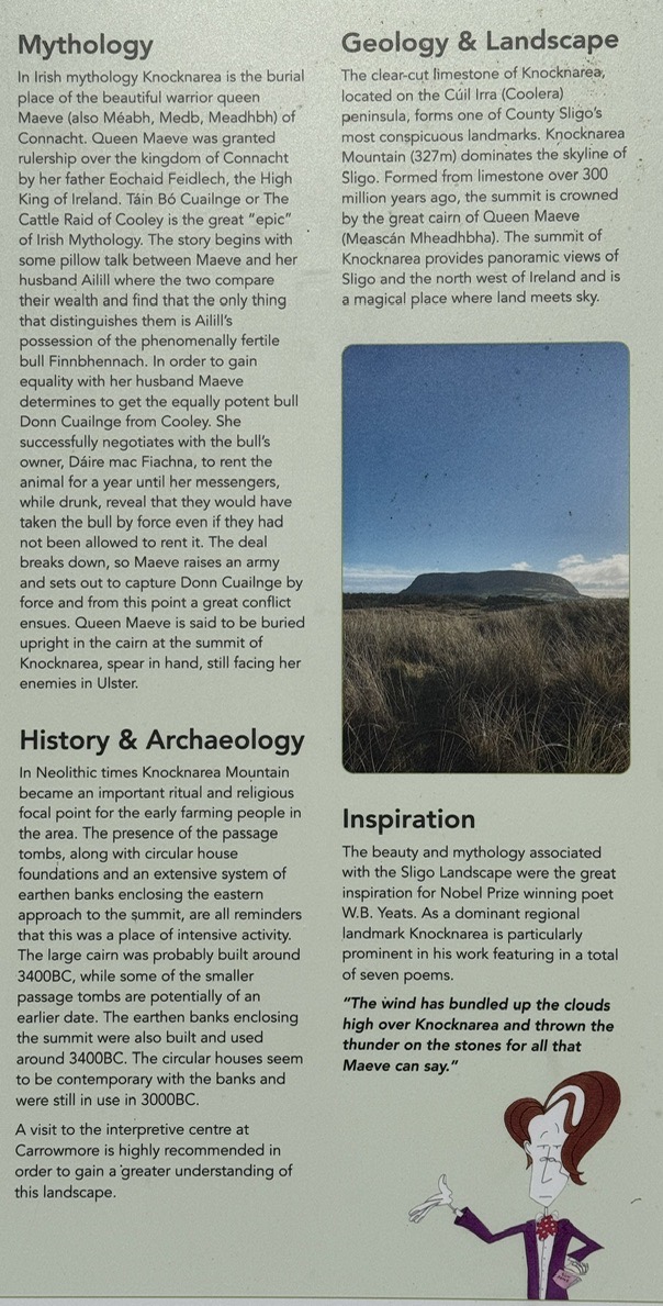 This was on the wall in the restaurant “hooked” which had really nice food and very pleasant people working there. I highly recommend recommended it. At the hotel, Riverside Hotel, which is very pleasant by the way, right on the river. Make sure you get a Riverview room, the Reception person recommended the fish and chips at this restaurant. The fish was really excellent, not soggy and you get too decent pieces and you can order an option to “chips” such as the salad which was recommended and was very tasty.This was from my room which was of course a RiverviewThis is kind of a very interesting old post officeThe Sligo City Hall The city Plaza Below you can see one of the ancient burial sites. The entrance was closed so I took a photo from the distance. This is one of the ancient burial sites It’s a little difficult driving and taking photos at the same time but I was able to snap this one horse buggy going by deep in the countryside Looking out at the farms and some residential areaI didn’t know at the time this was the place of Yeats. He is buried in Sligo and you will see the photos belowThis is the Knocknarea mound and on top is the burial site of queen Maeve. This mound on top of this hill is almost 6000 years old.It’s a rough pathway up the hillAn explanation of the trail in the area Beautiful views from the top of the hillThis actually reminds me of Champasak in Lao which is in the Pakse areaThis is the view of the path while walking downYou can see the city of Sligo in the distance Here is the mound and on top of that you can see the top of Queen Maeve’s tombThen I went down to Strandhill beachOn my way to Donnegal I saw a sign for “Yeats grave” so I decided to stop by.A memorial to Yeats There are some very old graves here which have been neglected and fallen into disrepairThe grave of William Butler Yeats And then there is a memorial to the great disaster shipwreck the three ships of the Spanish Armada and thousands of sailors deadThe memorial to the shipwreck