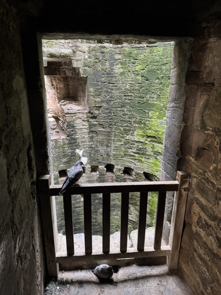 Clicking on the title of the section you will get a link to the history of the castle. It’s just a shell now but the shell is very impressive Walking around inside The birds were very comfortable here with the tourists. They obviously have taken over the castle, both see pigeons and the seagulls A view of the railroad tracks and a new tunnel entrance to the bridge which sort of matches the castle concept The seagulls are at home here This black bird and his buddy I caught just in flight which it was kind of cool The whole castle remains
